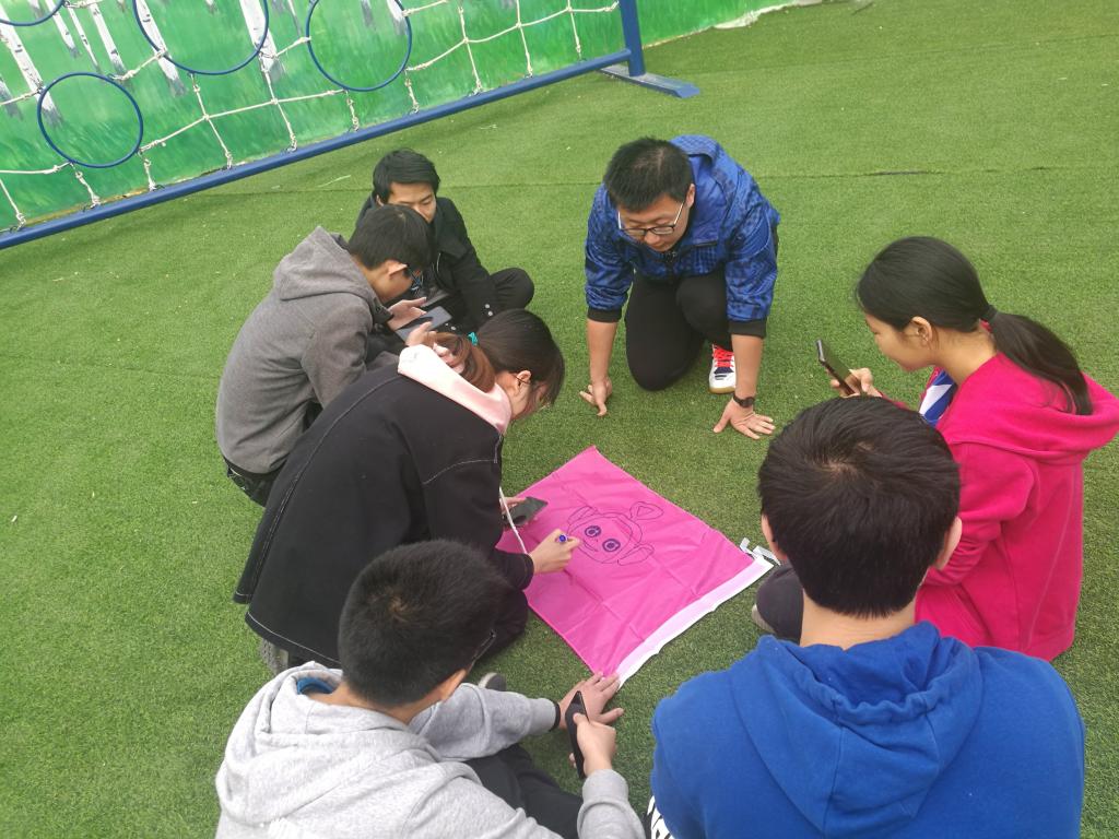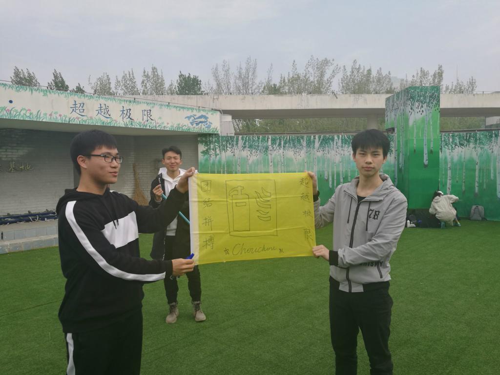 在位于知行北楼平台心理素质拓展基地,来自中法大一、大二、大三的不同班级的同学在经过简单的热身后被随机分为三队。队员们为自己的团队设计了队名、队旗与队歌。