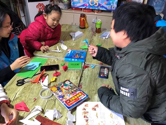 (志愿者在准备上午的折纸活动,有的小朋友在耐心的等待,有的跃跃欲试跟着志愿者折了起来)