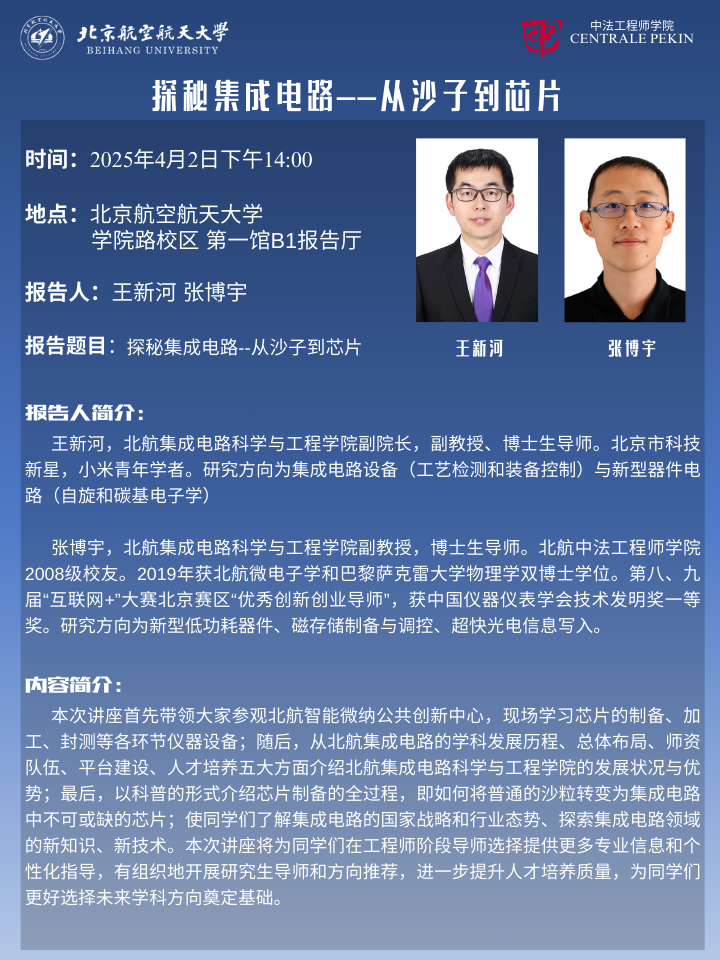 本周我们邀请到北航集成电路科学与工程学院副院长,副教授、博士生导师王新河老师;北航集成电路科学与工程学院副教授、博士生导师、北航世界杯官网2008级校友张博宇老师为大家带来校友讲堂:探秘集成电路——从沙子到芯片。