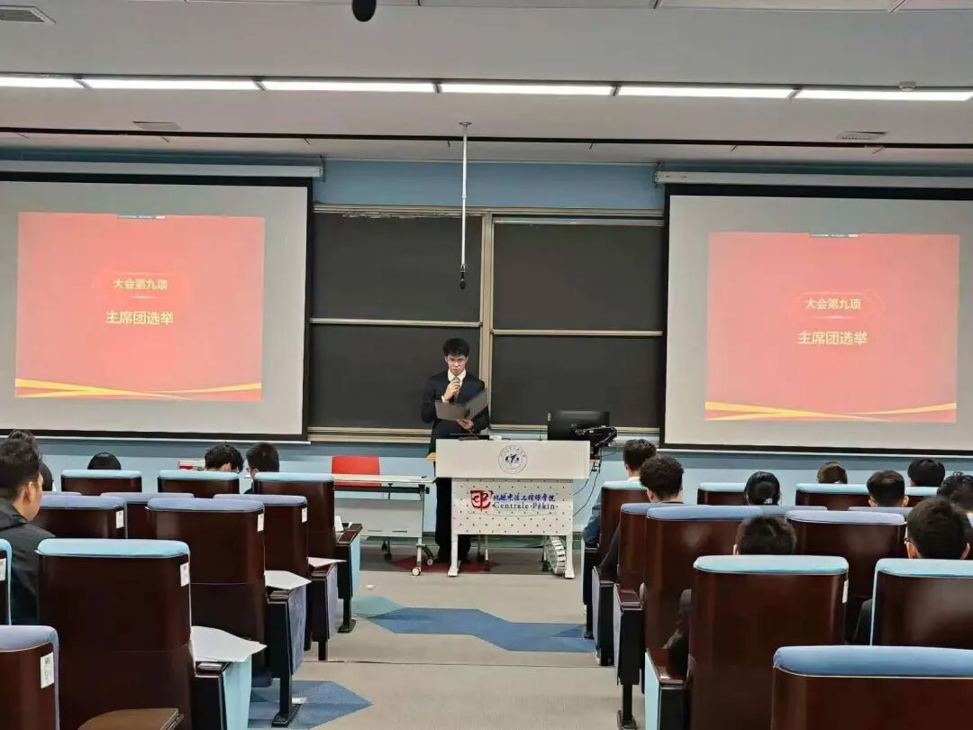随后,大会进行选举环节。主持人宣读了中法/国通学院第四次学生代表大会监票、计票人员名单与主席团选举办法。各位候选人依次上台进行个人陈述。