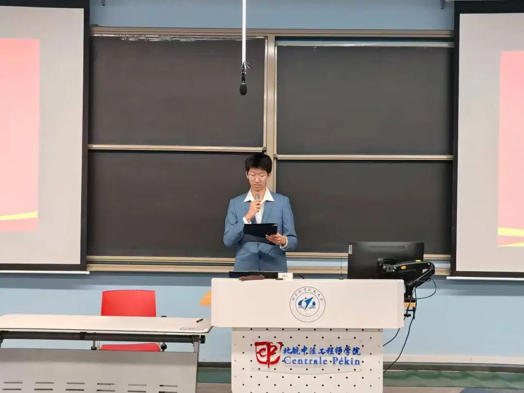 学院专职辅导员贾焕庭为大会致辞。他对大会的圆满举行和学生会过去一年的辛勤付出表示崇高敬意和诚挚感谢,并勉励大家以青年担当回应时代主题,在多元碰撞中构建文化共同体、以创新勇气定义未来工程师。他期许新一届的中法/国通学生会以习近平新时代中国特色社会主义思想为指引,坚守全心全意为同学服务的宗旨,不断提高政治站位,发挥好桥梁纽带作用,共同开创中法/国通学生会更加灿烂的明天。