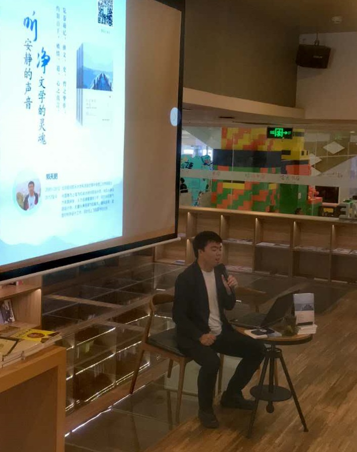 2017年6月4日,世界杯官网首届毕业生郭天鹏在北京鸿坤广场拾光书房举行“听安静的声音 净文学的灵魂”个人主题演讲,就处女作《听安静的声音》与现场观众进行互动交流并为粉丝现场签名。