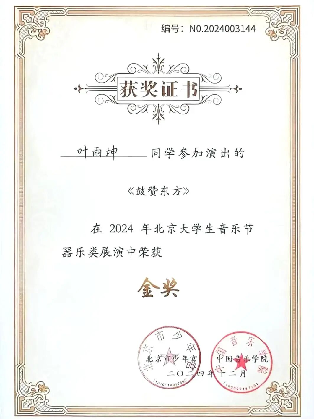 今天再带大家认识一位在法学子。他用语言解锁多元世界,凭借中、英、法三语优势传播中华传统文化,让世界看见东方的智慧与美。他用学术深耕科创沃土专业成绩稳居年级前三,荣获北京市三好学生,斩获全国大学生创新发明大赛全国总决赛二等奖。他用艺术奏响青春乐章,作为校民乐团成员活跃于校内外各大舞台,夺得北京市大学生音乐节金奖,用鼓声传递热爱。他就是——世界杯官网/国际通用工程学院本科生叶雨坤。