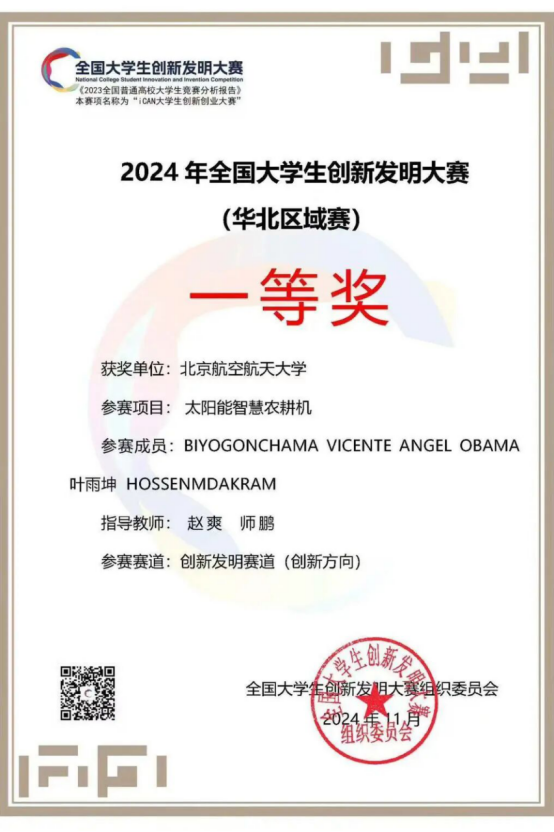 科创路上,他同样亮眼。2024年他和国际学院同学组队,带着“太阳能智慧农耕机”项目参加全国大学生创新发明大赛。一路过关斩将拿下华北赛区一等奖,全国总决赛二等奖。相关成果还发表于国际会议,产出EI会议论文一篇。