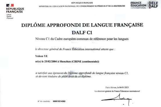 叶雨坤获得DALF C1高级法语文凭。