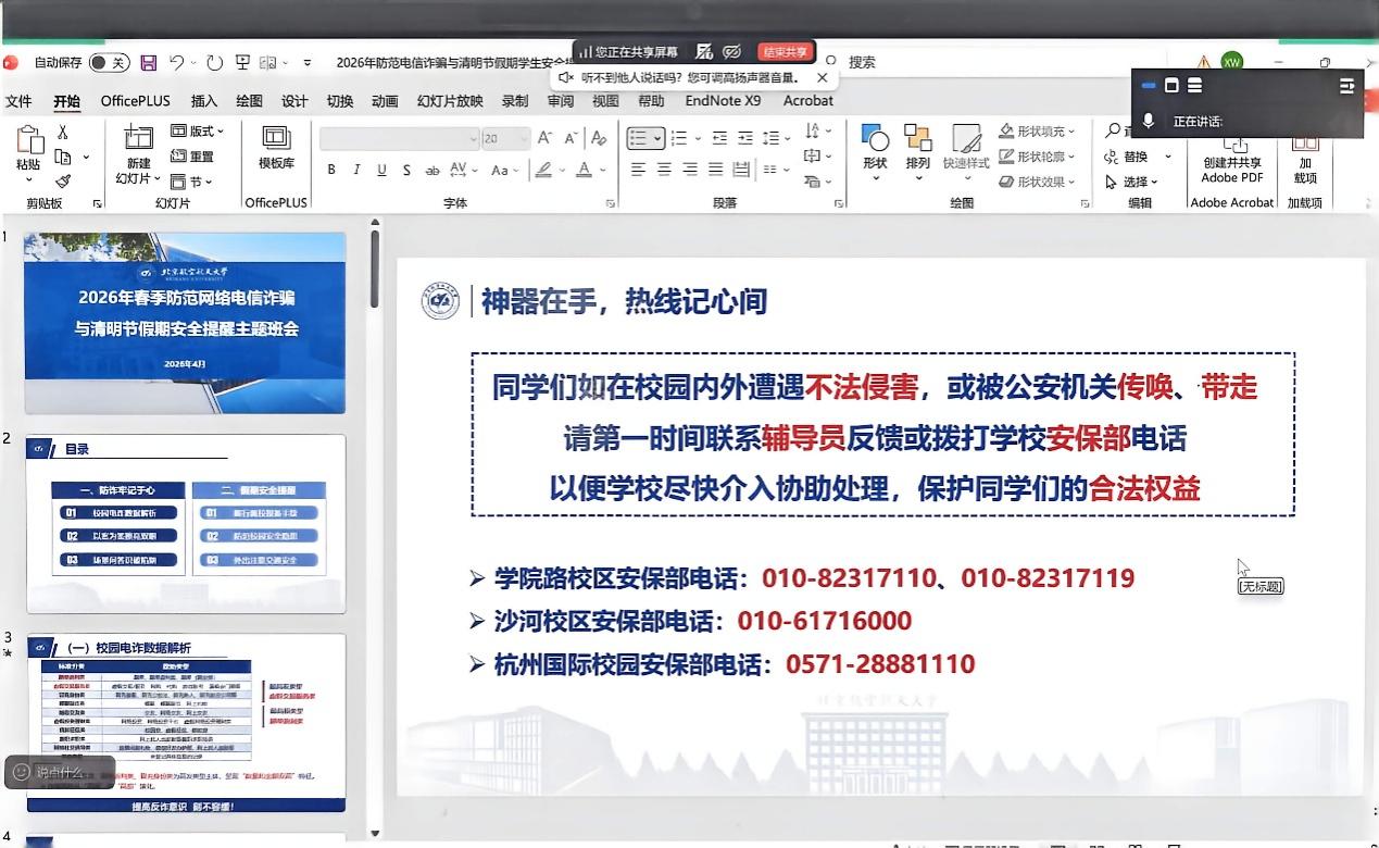 会议明确工作时限与要求,学院本研各年级通过线上线下相结合的方式召开主题班会,实现出行安全、宿舍安全、反诈提醒全覆盖,切实将安全工作要求传达到每一位学生,推动校园安全工作落地见效。