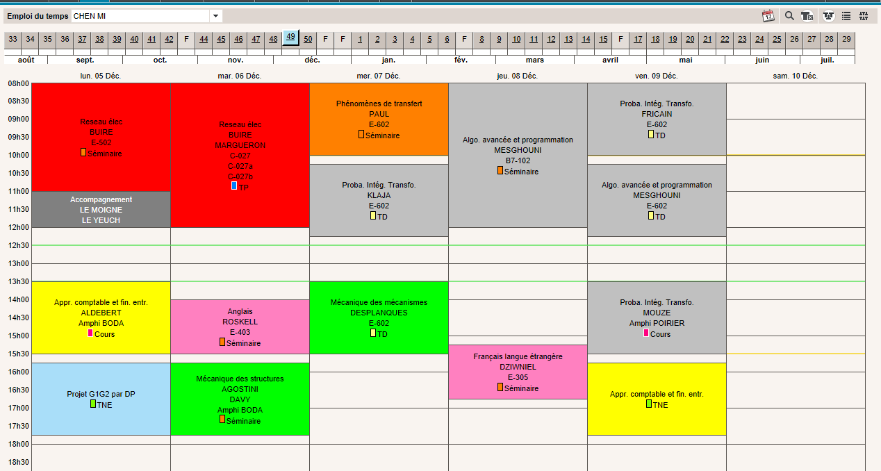 就课时而言,由于里尔中央理工将实习放在了一月份到二月份。于是S5的课程被安排的较为紧密。一周的课时在30至40个小时不等。同时这里的课间休息是2个小时一次,每次15分钟。这对于集中注意力有比较高的要求。