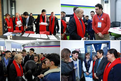 勒德里昂先生和徐惠彬校长与参会企业交流,参观中小企业展区,充分了解校企合作情况;询问了中外学生的学习生活,勉励学子们早日成才。
