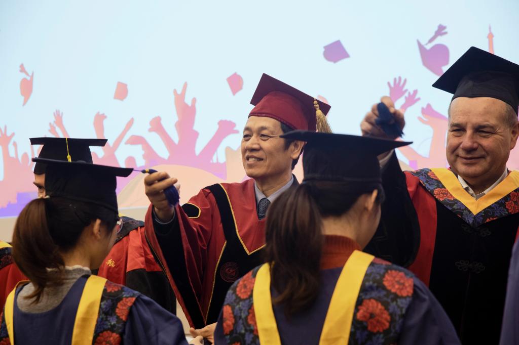 张巍宣布毕业典礼正式开始,所有人员起立,奏唱国歌。随后,世界杯官网分党委书记兼院长洪冠新教授宣读了2019届硕士学位授予名单,法方院长Frédéric GENTY教授宣读了2019届法国通用工程师学位授予名单。徐惠彬院士、黄海军教授、Romain SOUBEYRAN教授、Gérard CREUZET院士等为毕业生拨穗并颁发学位。典礼还对北京市优秀毕业生获得者、校优秀硕士论文获得者、“中国商飞-斯伦贝谢”优秀实习奖获得者进行了表彰。