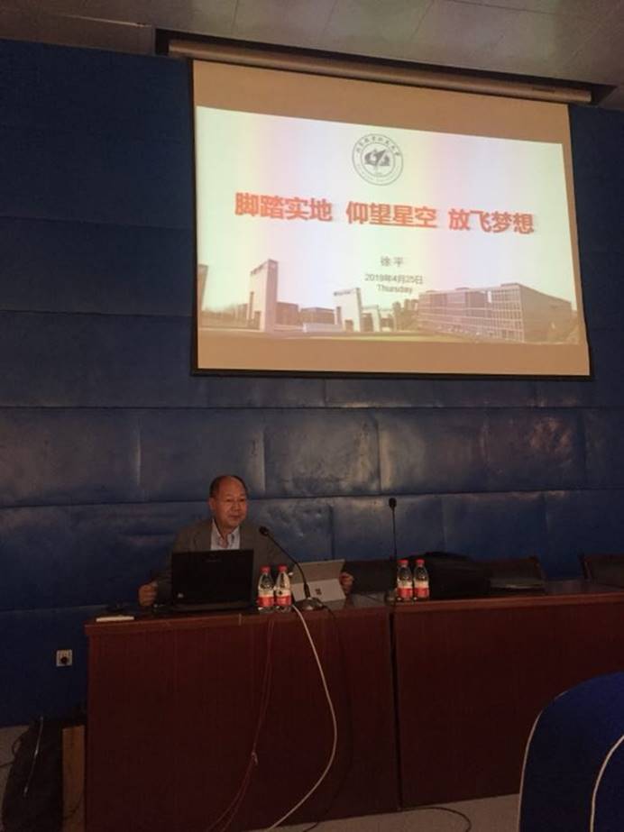徐平教授为青海油田第一中学做题为《脚踏实地 仰望星空 放飞梦想》的报告,报告从北航的建立展开,介绍了航空航天产业的重要性及北航为国家高精尖技术的发展所做的贡献。徐平教授以学生们高中的物理知识为基础,以承担的科研项目为载体,深入浅出地介绍了目前的科学技术的发展现状,以及中国在发展科学技术的过程中所面临的国外封锁,并向同学们提出了科技报国的期望。