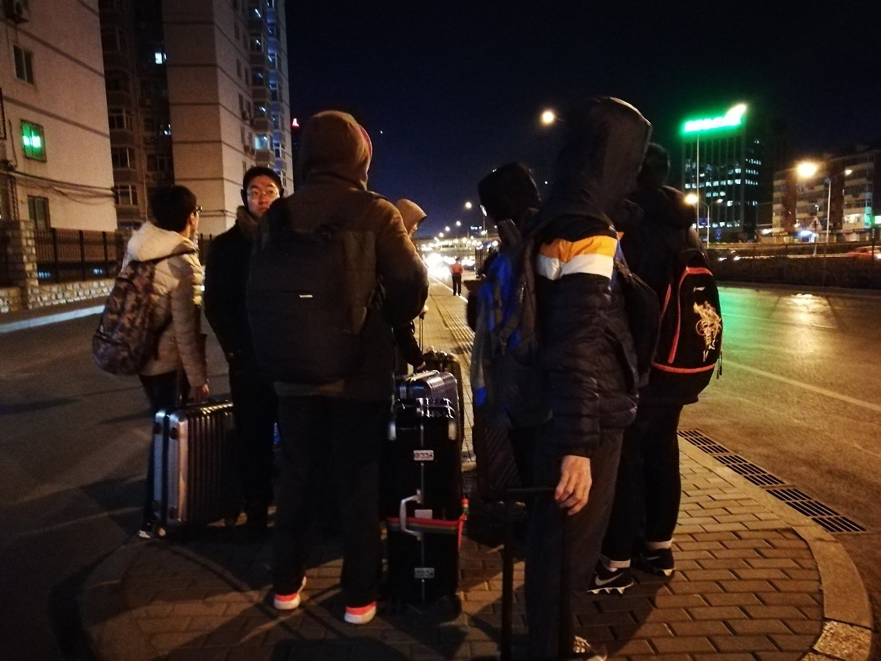 图 1  北京时间2017年2月4日晚学生们在北航北门等待机场大巴