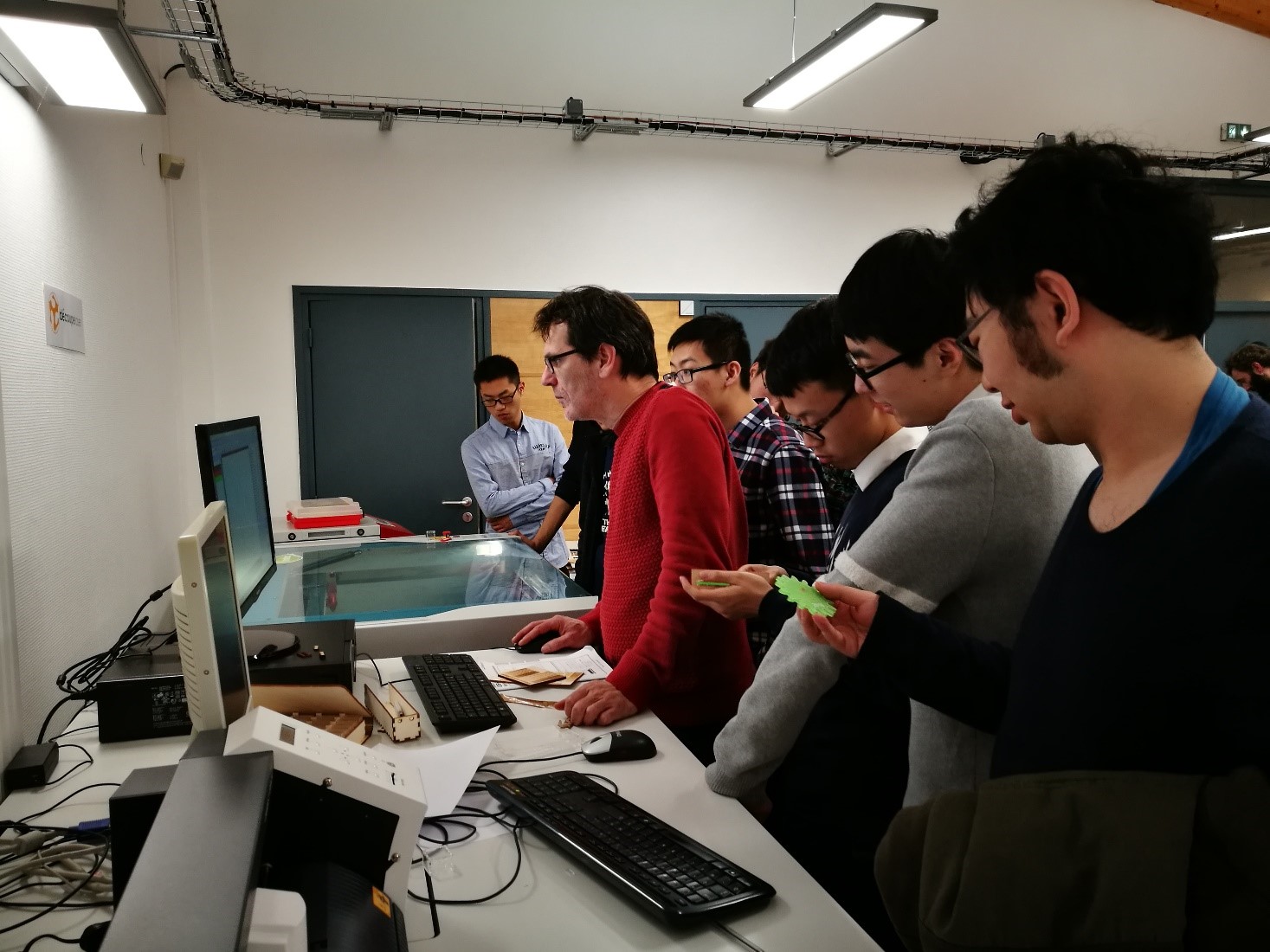 下午我们来到了里尔中央理工大学一个实践性特别强的教室——Fablab,这里是一个学生亲自动手进行特殊材料制备的实验室。学生们主要参观了切割、雕刻、3D打印、激光扫描等仪器并进行了简单的操作。