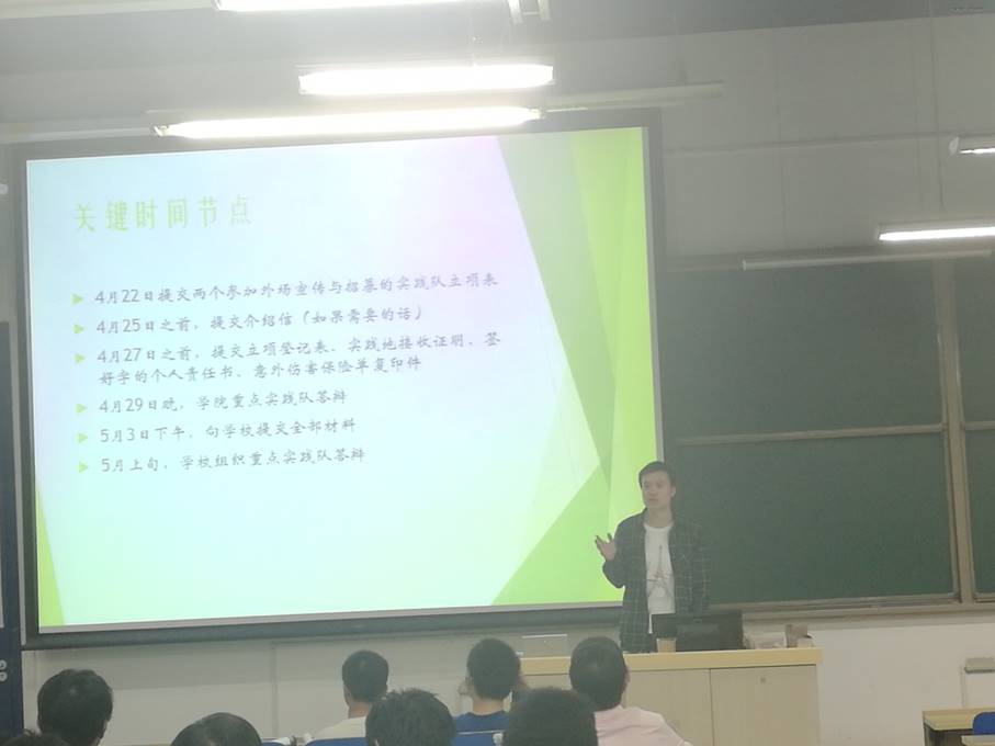 会议先是由王进导员强调实践前准备的关键时间节点,然后又介绍了山西省的扶贫项目,强调了在准备过程中的操作细节,也对校重点实践队的评选进行了说明,王导再次强调了此次暑期社会实践的重要性,并对同学们的提问进行答疑。