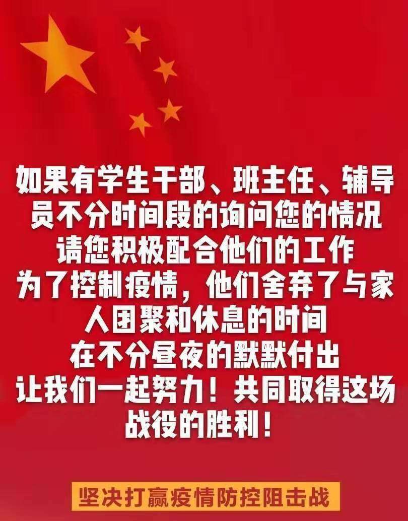 24日,除夕,记得那是第一次对学生“全覆盖”,适逢一家三口回姥姥家里过年,虽然只是几条街道之隔,但是我仍然记得回家一路上,为了寻找一个除夕还没回到家的学生,不断地联系学院副书记李牧老师,那时李书记还坚守在学校的岗位上,帮助我去宿舍确认学生是否已经离校。