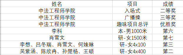 本次运动会上,中法学子取得了优异的成绩。其中趣味项目以集体总分87分成绩获得最高奖项“优胜奖”,广播操比赛获集体三等奖,入场式获评集体二等奖,个人比赛也荣获佳绩。