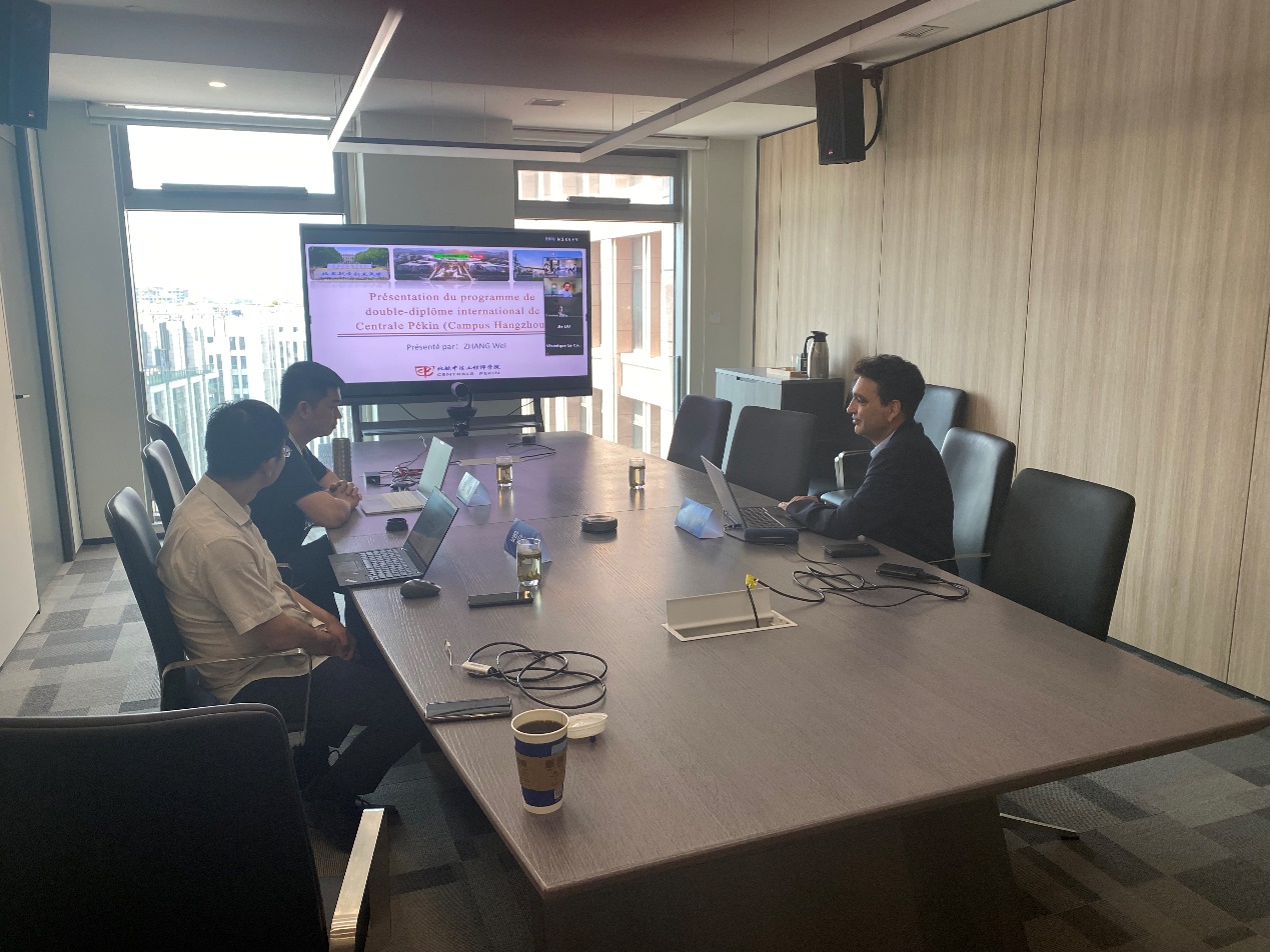 随后,学院采取线上线下结合的方式,举行首届杭州双学位硕士研究生教学研讨会。法方院长、中方副院长与法方巴黎中央理工高电、南特中央理工和里尔中央理工的硕士双学位项目负责人,部分参与杭州双学位授课的教师共同参加。中法双方就第一年的培养进行了充分的沟通与总结,详细制定了第一届学生赴法后的相关教学安排,并对双方共同指导第二届学生硕士论文课题的相关细节进行了充分的交流与探讨。