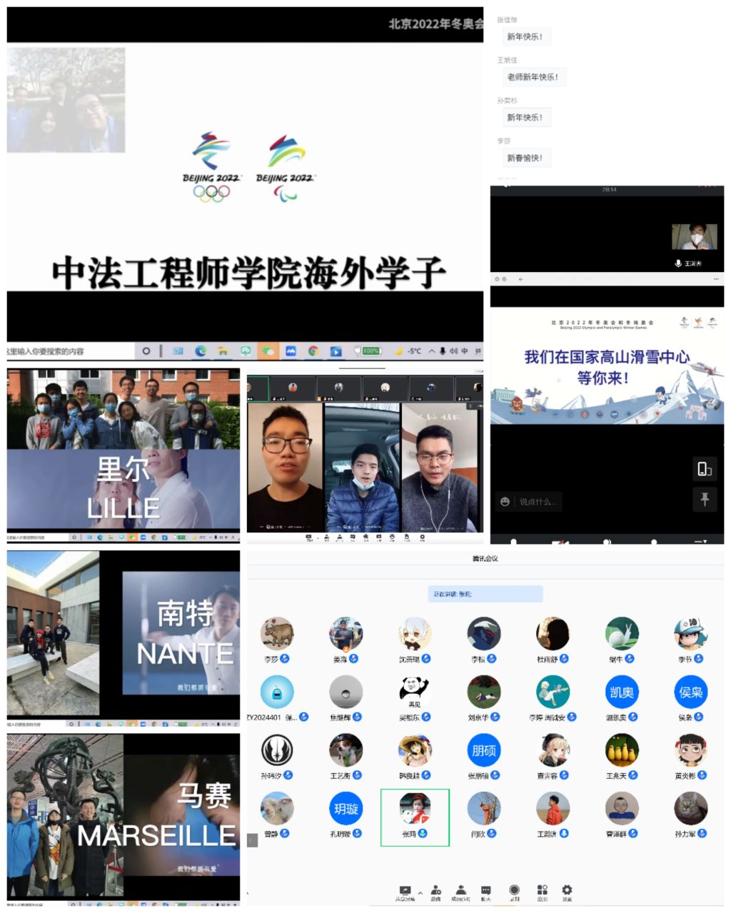 同时,远在千里之外的法国还有学院65名在外交换的本、研学生将在异国他乡度过这个春节。1月29日晚,学院分团委书记张莉老师带领本研辅导员组织召开全体境外学生线上会议。会上参加本次冬奥志愿工作的专职辅导员姜淼和研究生辅导员王瀚洲向大家介绍冬奥会的前期准备工作,在法学生也分享了他们近期生活和学习情况,张莉老师也动员在法学生积极参与学院和学校的科技创新国际赛道,提醒同学们在境外非必要不聚集,做好个人防护,并代表学院向各位同学送去新春祝福。
