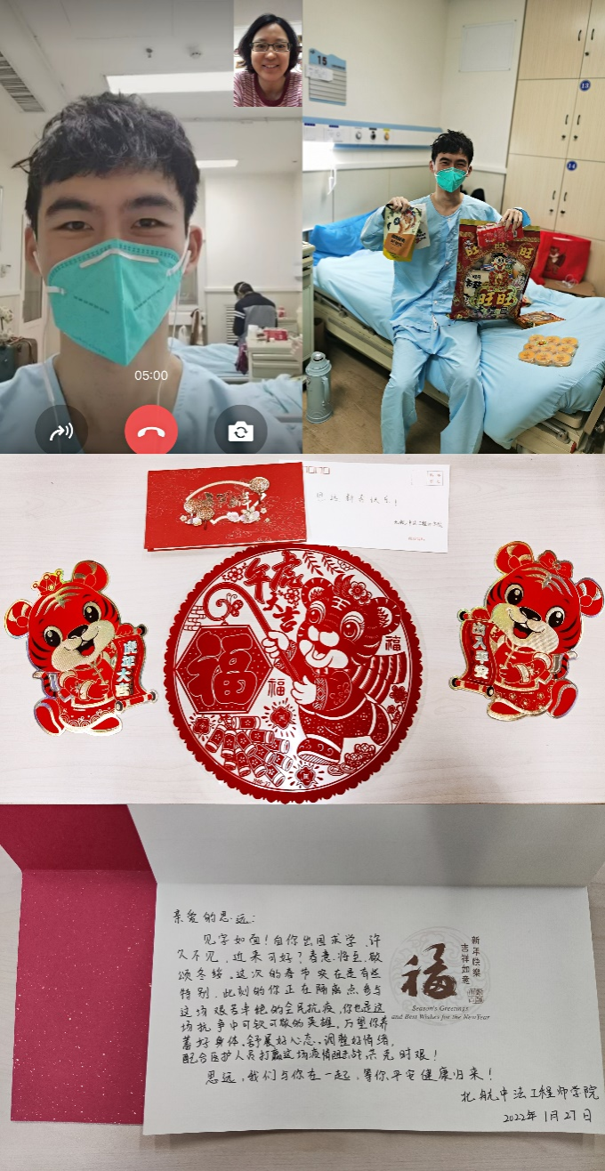 此外,还有一位不能回家过年的特殊同学研究生陈思远,他刚刚自法国交换学习结束回国,目前正在广州隔离。辅导员和班委不仅经常与陈思远同学视频连线,关心他的身体情况和隔离状态,更是为他精心准备了贺卡、新春礼物和暖心大礼包,带着学院老师和同学们的祝福飞向了他——“思远,我们与你在一起,等你平安健康归来。”