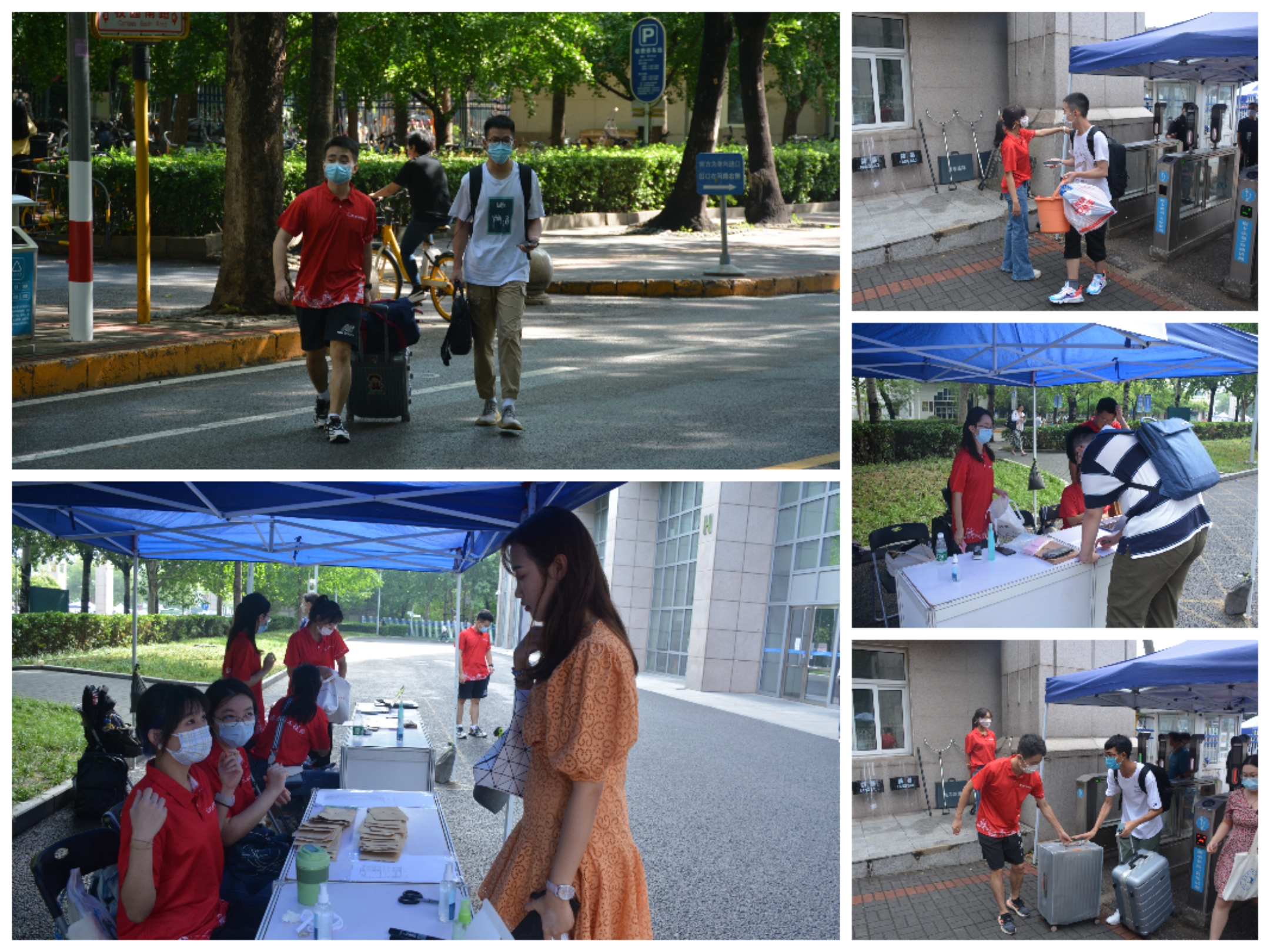 7:00,志愿者们全员就位,有的在迎新点整理物资,有的在校门口等候,有的已搭乘摆渡车前往宿舍楼踩点。