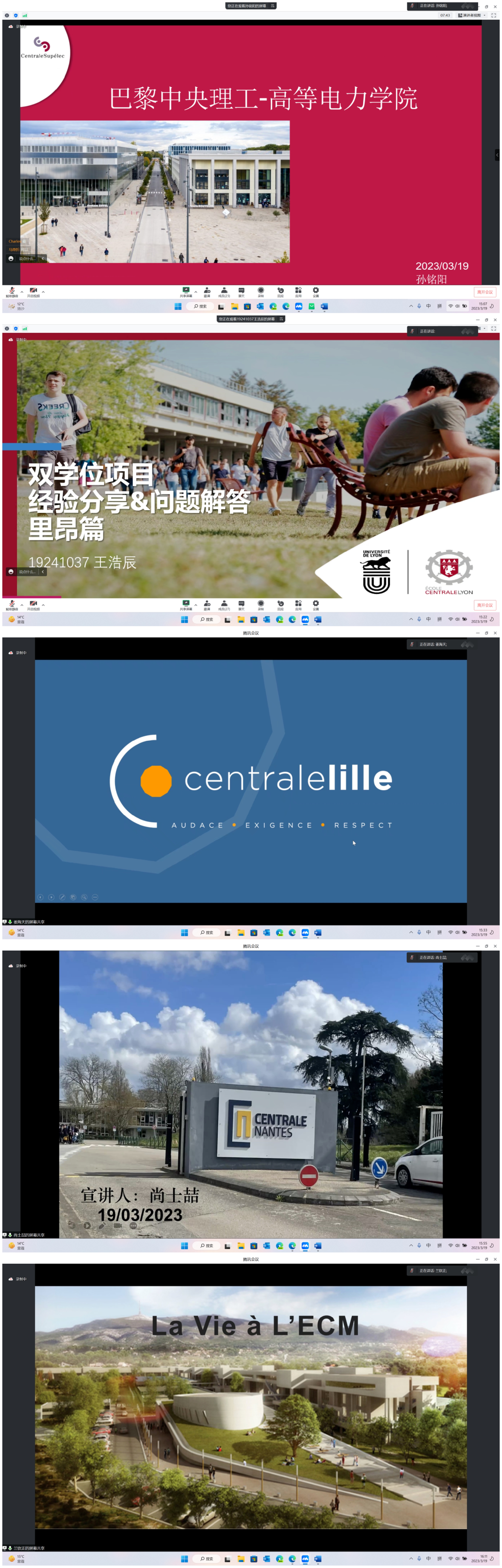 本次分享会邀请了学院2019级本科生孙铭阳、王浩辰、姜海天、尚士喆、兰钦正五名同学,分别就五所Centrale院校学校情况、课程设置、学习环境、课余生活等方面进行介绍。