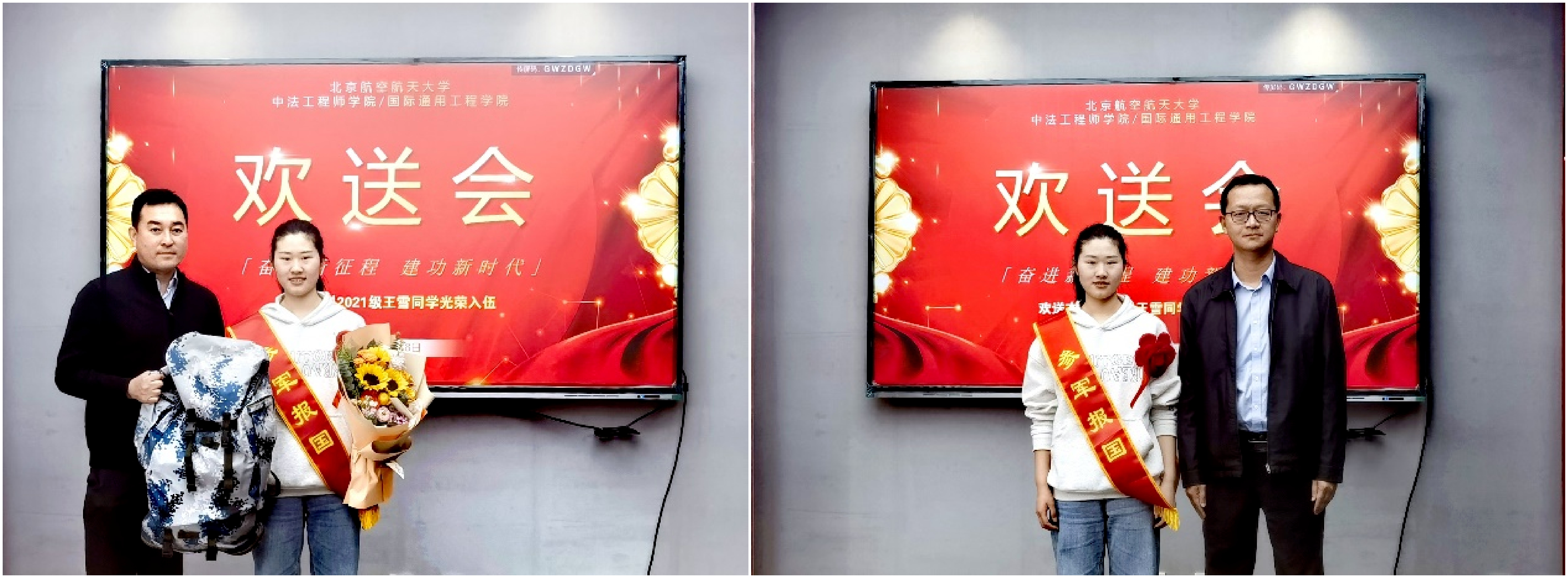 党委书记张江充分肯定了王雪同学参军报国的理想,他表示,党的二十大报告强调,加快把人民军队建成世界一流军队是全面建设社会主义现代化国家的战略要求。参军入伍是深入学习贯彻习近平强军思想,践行北航空天报国精神的光荣使命。学院将继续深入推进征兵宣传工作,让更多的有志青年圆梦军营。他勉励王雪同学敢于挑战自我,充分发挥北航学科特点和学院国际化背景的优势,在军营中不断超越自我、淬炼成钢,牢记使命、建功军营。