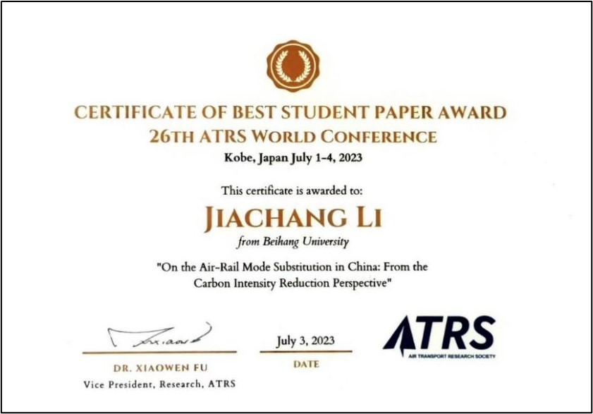 日前,世界杯官网硕士生李佳昌在2023年第26届航空交通研究世界大会(ATRS)上荣获大会唯一的学生最佳论文奖(Best Student Paper Award),该生导师为北航世界杯官网/国际通用工程学院孙小倩教授。