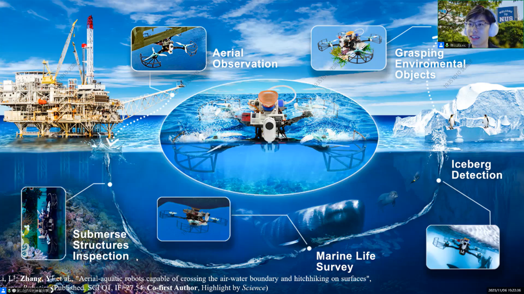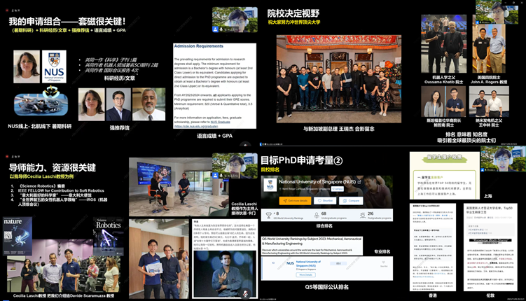 紧接着,张以远向同学们详细介绍了自己本科阶段参与的工程及科研经历与收获。本科前两年,他将主要精力放在工程实践上,在逐渐明确了求学规划后,他将重心转向于科研研究,以便更好地进行留学直博的申请。他进入到文力老师实验室,进行了跨介质仿生吸附机器人的设计,成果以共同第一作者身份发表在《Science Robotics》上。基于自己对仿生软体机器人的浓厚兴趣,张以远选择继续在此方面进行博士阶段的学习和科研。张以远博士师从“软体机器人之母”Cecilia Laschi教授,并获得全奖资助。目前他主要研究方向为关于仿生章鱼臂的水下应用的实现方法。