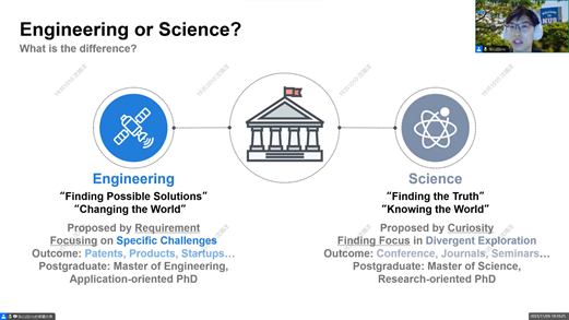 张以远首先讲解了他对工程和科学两者的认知,强调兴趣是最好的导师。工程是利用已有技术改变世界的过程,来自于人类对生活各方面的需求,所得的结果也更偏向于实用;而科学更关注对世界较为发散性的探索,发源于人类广泛的好奇心,研究的成果相对生活较远但更充满新奇。同学们应该先清晰自己对于工程或科研的兴趣,这样能更有助于对深造领域的抉择。