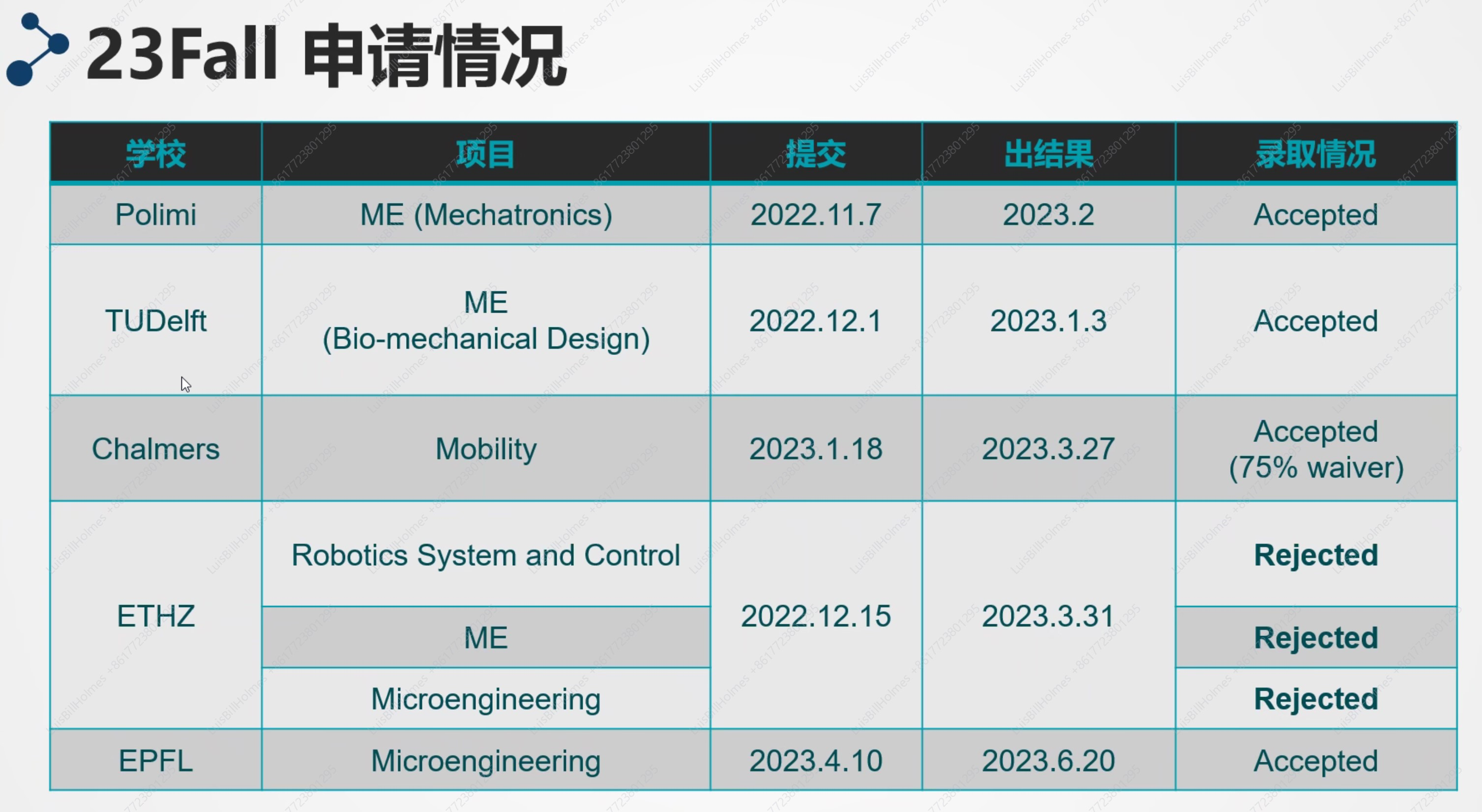 接下来栾贺云向同学们分享了申请中的重点及相关注意事项。他首先指出准备申请各种学校的项目的时候,要认清各个学校提供offer的指标,例如洛桑联邦理工不强制要求申请者的语言成绩;不要只看项目名称,要充分了解项目的课程体系设置;申请要有一定梯度,合理选择保底学校与项目;做好申请规划与记录,将项目所需的材料及相关时间节点做成表格,时刻掌握申请进度;要看清材料数量,一些重要材料例如推荐信、文书等需提前准备;充分利用好一切可利用的资源,如小红书、B站、fiverr和LinkedIn等。