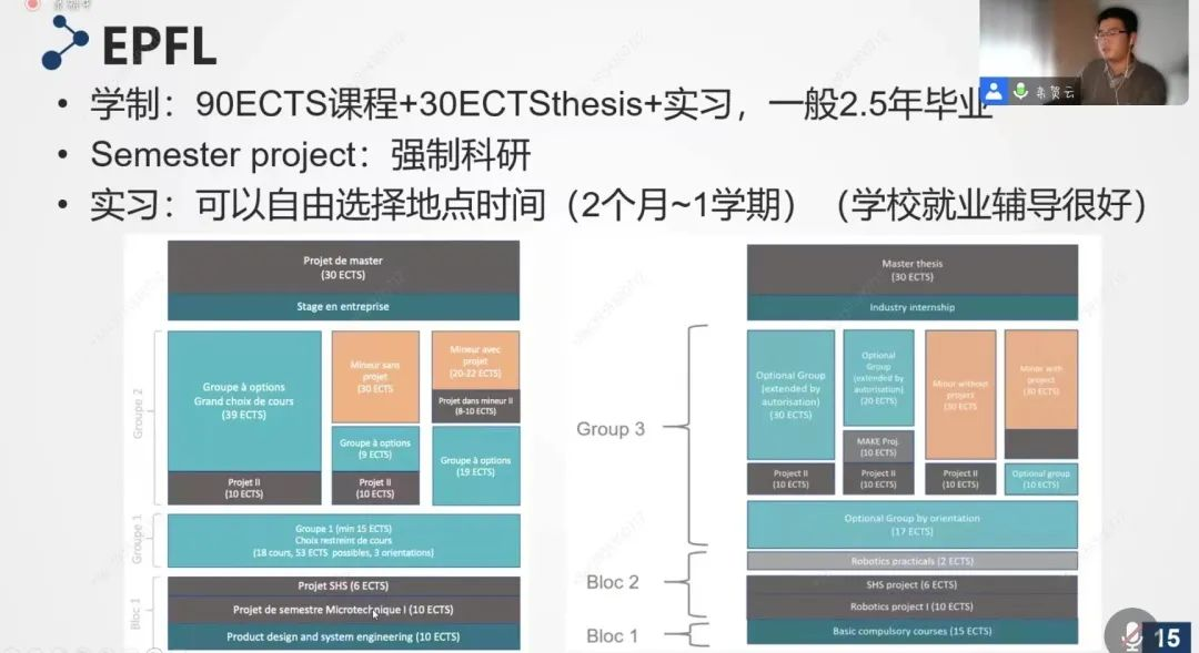 栾贺云向同学们详细介绍了EPFL的硕士课程体系和他在EPFL的学习生活。EPFL的硕士项目一般是2.5年制,包括有90学分的课程、30学分的学位论文和强制实习;实习可以自由选择地点时间,时长通常为半年,这对毕业后的就业帮助很大;学校提供了强有力的就业指导,为学生提供合适的求职培训,定期举行大型招聘会,吸引来许多欧洲著名企业进行宣讲招聘。