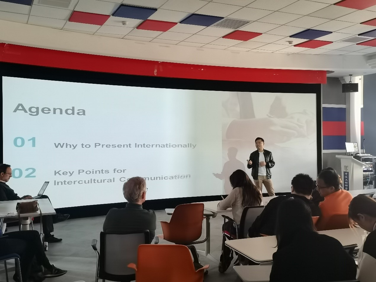 接着,来自赛峰中国的学院06级校友魏斌工程师结合工作中与不同文化背景的同事相处共事的切身体会,结合亲身项目经验从语言、文化和沟通三个方面进行了生动的分享,并从理解谈话对象的真正诉求、确定正确的交谈对象和选择恰当的交流方式方面给出了实用建议。