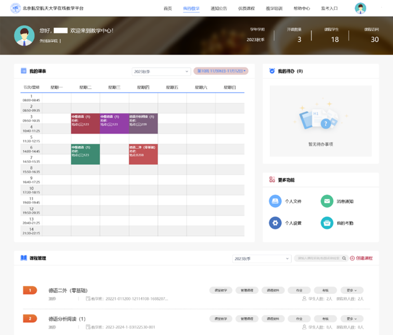 信息化的广泛应用也给学生日常学习生活带来诸多便利。学校借助信息化手段,持续整合业务系统,关键业务线上化,简化业务流程,实现学籍异动跨部门审批线上办理;实现移动端查询全校课表、教师工作量、教师课表、学生成绩和进行课程评价,推进教学管理移动化进程;优化升级北航在线教学平台,组织教师和助教进行平台培训推广,支撑混合式教学模式,目前登录次数5万余次,共建立课程1.8万余门次。
