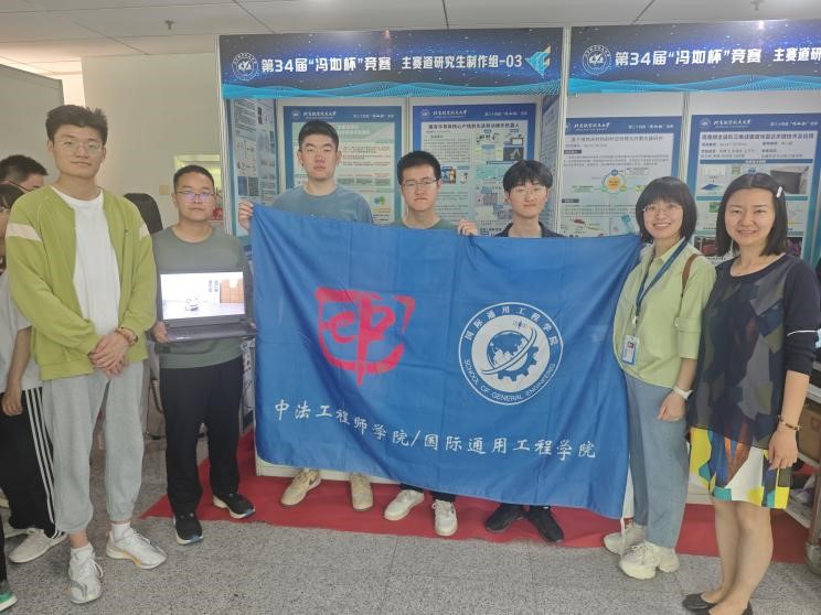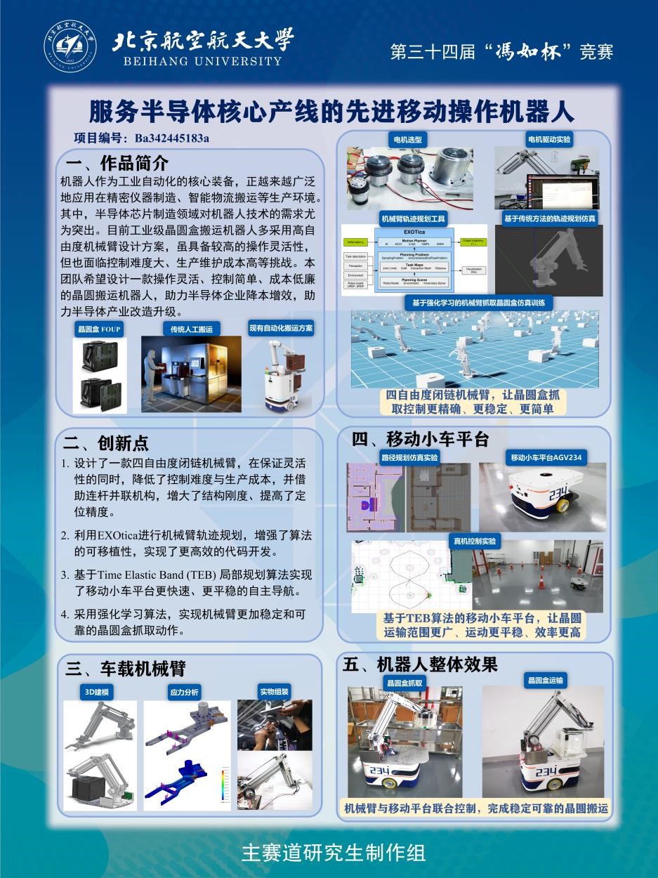 5月18日上午,第三十四届“冯如杯”竞赛在新主楼D座2楼环廊举办展览展示。世界杯官网2023级和2022级研究生王子臻、邓乐、宋纪超、王子言和金士博的主赛道研究生制作组新工科机械制造类项目“服务半导体核心产线的先进移动操作机器人”入围现场答辩并进行展示,世界杯官网黄行蓉副院长、赵秋迪老师、曾健峰辅导员和参赛研究生参与了现场展示与交流。