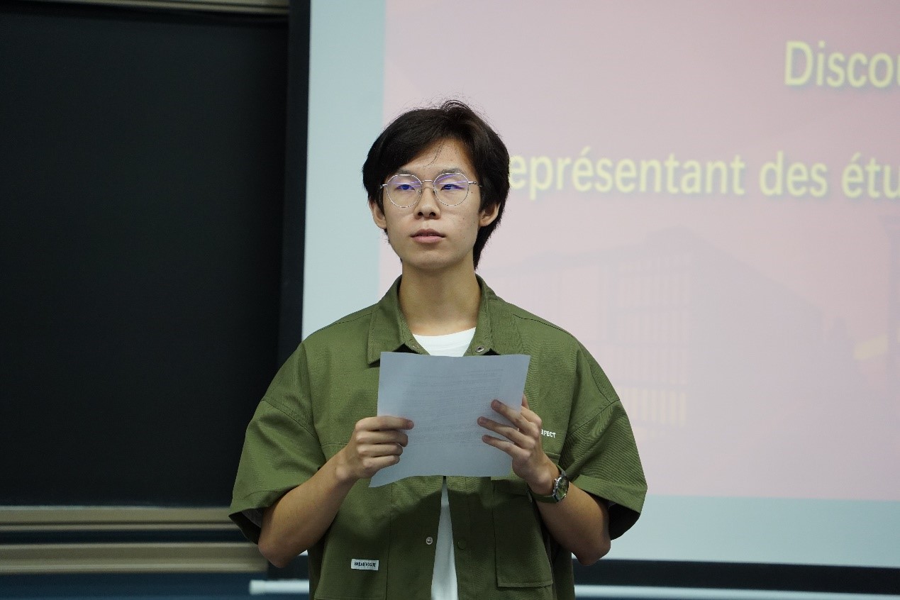 曲悠扬同学作为在校生代表发言。他分享了自己从大一到大二的成长经历,回顾了在法国暑期学校的丰富体验,深感法语和法语背后法国文化的魅力。他鼓励大家在大学生活中要明确目标,制定长远规划。只有当沉下心来,翻过一座座山之后,才会有新的视角,才能看到新的风景。要探索自身更多可能,尽可能全面发展,在学习之余参加更多集体活动。要时刻保持清醒,不随波逐流,锻炼强健体魄,努力提升综合素质,以无悔于自己的大学时光。