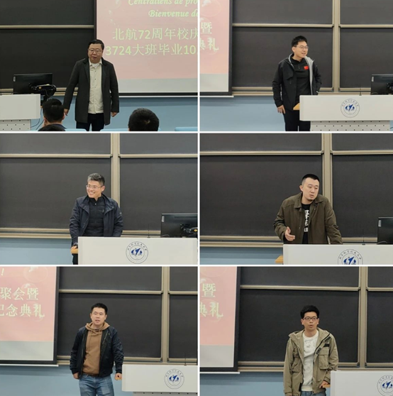 而后,校友们轮流上台,分享自己的近期发展与感想。有的校友谈到自己在航天领域的成就,参与了多个国家重点项目,为推进航空技术创新贡献了力量;有的校友则在海外深造,如今在法国知名高校从事科研工作,研究领域涉及人工智能和大数据,为中法科技合作添砖加瓦;还有的校友选择回到家乡创业,将在北航学到的知识应用到环保和新能源产业,致力于推动地方经济和绿色发展。一位校友特别提到,她在担任企业项目经理期间,时常感受到北航严谨治学的影响,帮助她带领团队顺利完成了多个复杂的国际项目,获得了客户的高度评价。另一位校友则分享了自己在国家机关工作的经历,表示北航的学习经历让他在处理复杂问题时更加从容,并在公共管理领域取得了不小的成就。校友们的分享内容丰富多样,每一段经历都展现了他们在各自领域中的努力与贡献,引发了在场师生的热烈掌声和深深的共鸣。