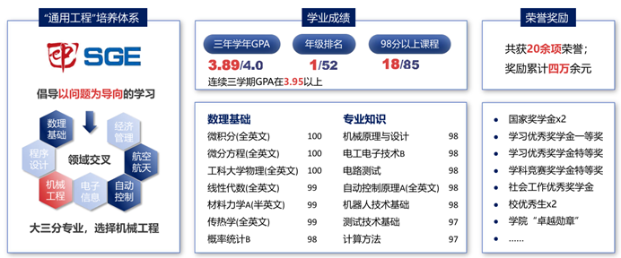 喻周扬本科期间秉承“通专融合”的理念,在学习中寻找研究兴趣和特长。在核心课程全英文授课的环境下,克服语言障碍,学业成绩排名专业与年级双第一,连续三学期GPA3.95以上,学术基础扎实。