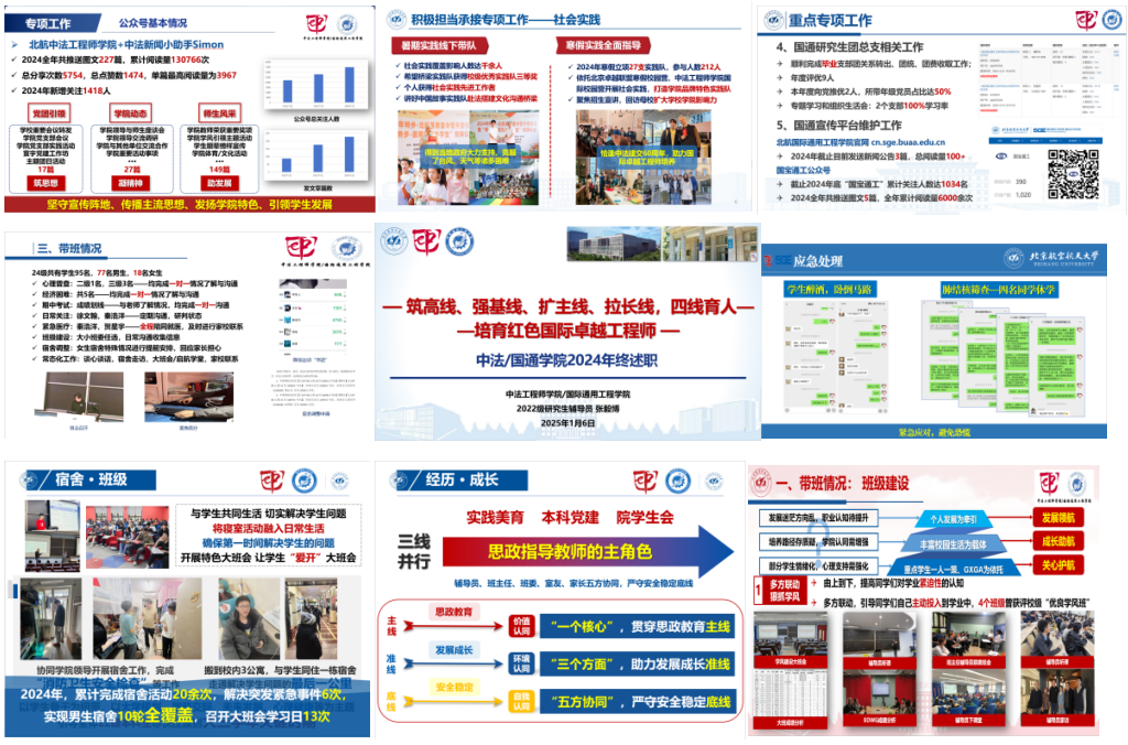 会议中,各位半脱产辅导员依次从思想引领、成长服务、党团班级建设、总结反思等几个方面,多角度多层次地对各自负责的带班工作与专项工作进行了系统而详实的总结,每个人结合实际都提出了自己关于辅导员工作的深入思考和未来展望。
