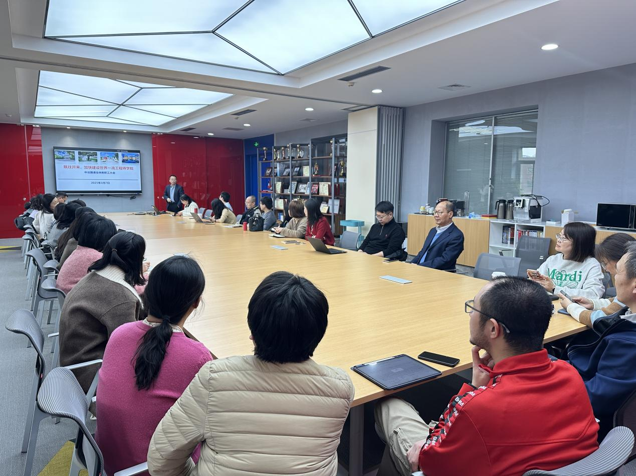 耿立升院长向全体教职工传达学校2025年度工作会精神,结合学校2025年工作重点的7大方面、32项要点工作,深入解读与全体教职工息息相关的重要内容,并作了题为《继往开来,加快建设世界一流工程师学院》的工作报告。结合学院与学校签署的2025年度目标任务和关键指标,重点对学院2025年度重点工作进行了全面部署。他强调,2025年是学院建院20周年,是学院建设发展的关键年。围绕院庆,学院将开展贯穿全年的系列活动,将认真贯彻落实学校数聚合力、智创未来的要求,全面提升办学质量。他重点从人才培养、科技创新、师资队伍、国际合作、党建和组织运行等方面,对各项工作提出了具体要求,号召全体教职工凝心聚力,共绘学院发展新蓝图。
