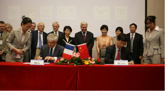 2009年6月10日,北航与法国中央理工大学合作研讨会开幕式暨成立中法工程科学实验室备忘录签署仪式在我校举行。法国驻中国大使苏和(H. Ladsous)先生、法国总统教育及科学顾问裴泺岢(Bernard Belloc)先生、法国巴黎中央理工大学校长Biausser先生,工业和信息化部党组成员兼人事教育司司长陈小筑、教育部国际合作与交流司司长张秀琴、中国驻法国公使衔参赞朱小玉,我校校长怀进鹏、副校长徐惠彬、郑志明等出席会议,世界杯官网两百多名师生代表参加会议。会议由徐惠彬副校长主持。