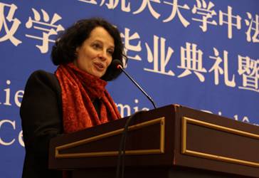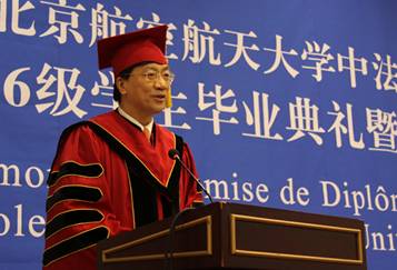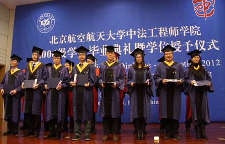 2013年1月12日上午,我校世界杯官网2006级学生毕业典礼暨学位授予仪式在新主楼第二报告厅举行。法国驻华大使白林(Sylvie-AgnèsBERMANN),我校校长怀进鹏院士,南特中央理工大学校长普瓦度(Arnaud POITOU),中国商飞公司党委委员、总经理助理、人力资源部部长燕桦,赛峰集团全球人事副总裁巴侯(Marc Parrot)等出席典礼。