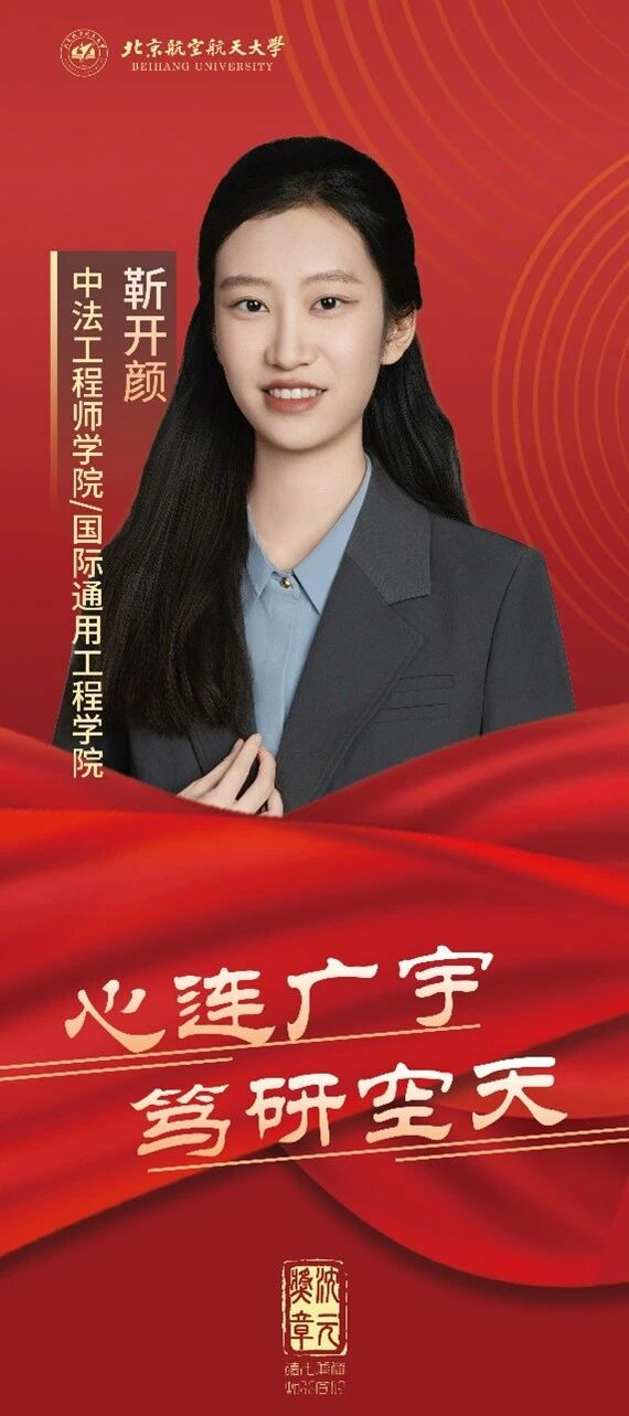 靳开颜在中法/国通就读期间,硕士学业GPA成绩排名第一,并获得研究生国家奖学金、北航三好学生等荣誉。在科学研究方面,她投身相变发汗冷却的数值模拟方法的研究,攻坚克难。自攻读研究生以来,在相关领域共发表SCI论文5篇,其中以第一作者身份发表3篇,努力走在创新创造的前列,把论文写在祖国的大地上,把学术理想融入国家的航天事业中。