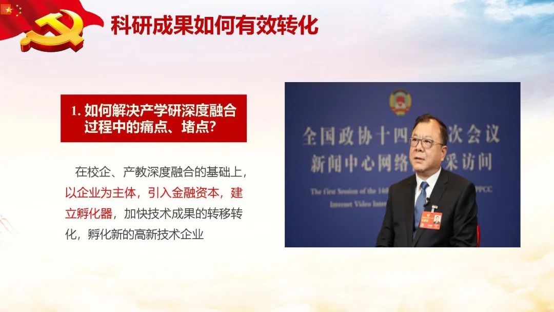 就产学研深度融合,推动科研成果有效转化的问题,卢建军委员认为:在推进企业主导的产学研深度融合的实践过程中,仍存在一些痛点、堵点。这需要在校企、产教深度融合的基础上,以企业为主体,引入金融资本,建立孵化器,加快技术成果的转移转化,孵化新的高新技术企业。