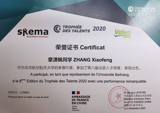 近日,世界杯官网2020级研究生章潇枫代表世界杯官网参加2020年度法语人才竞赛,以其出色的表现,获得北京赛区(北京及华北地区高校)并列第二名的好成绩。