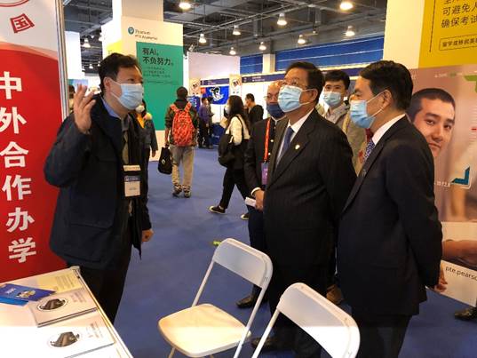 中国教育国际交流协会会长、教育部原副部长刘利民莅临学院展位指导工作,对学院多年来的人才培养模式表示了肯定,希望学院继续深化国际教育交流与务实合作,开拓更加开放多元的国际合作新局面。学院领导现场进行讲解介绍。