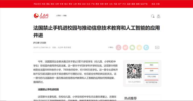 人民网刊登北航法国研究中心文章《法国禁止手机进校园与推动信息技术教育和人工智能的应用并进》2018-11-09