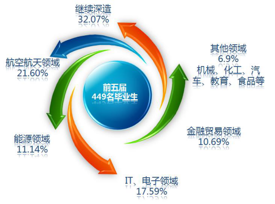 对毕业生的就业领域进行分析,前五届学生中,64.81%的学生选择了在国内工作,29.84%的学生选择了出国深造,而出国工作和在国内深造的各有近3.12%和2.23%。