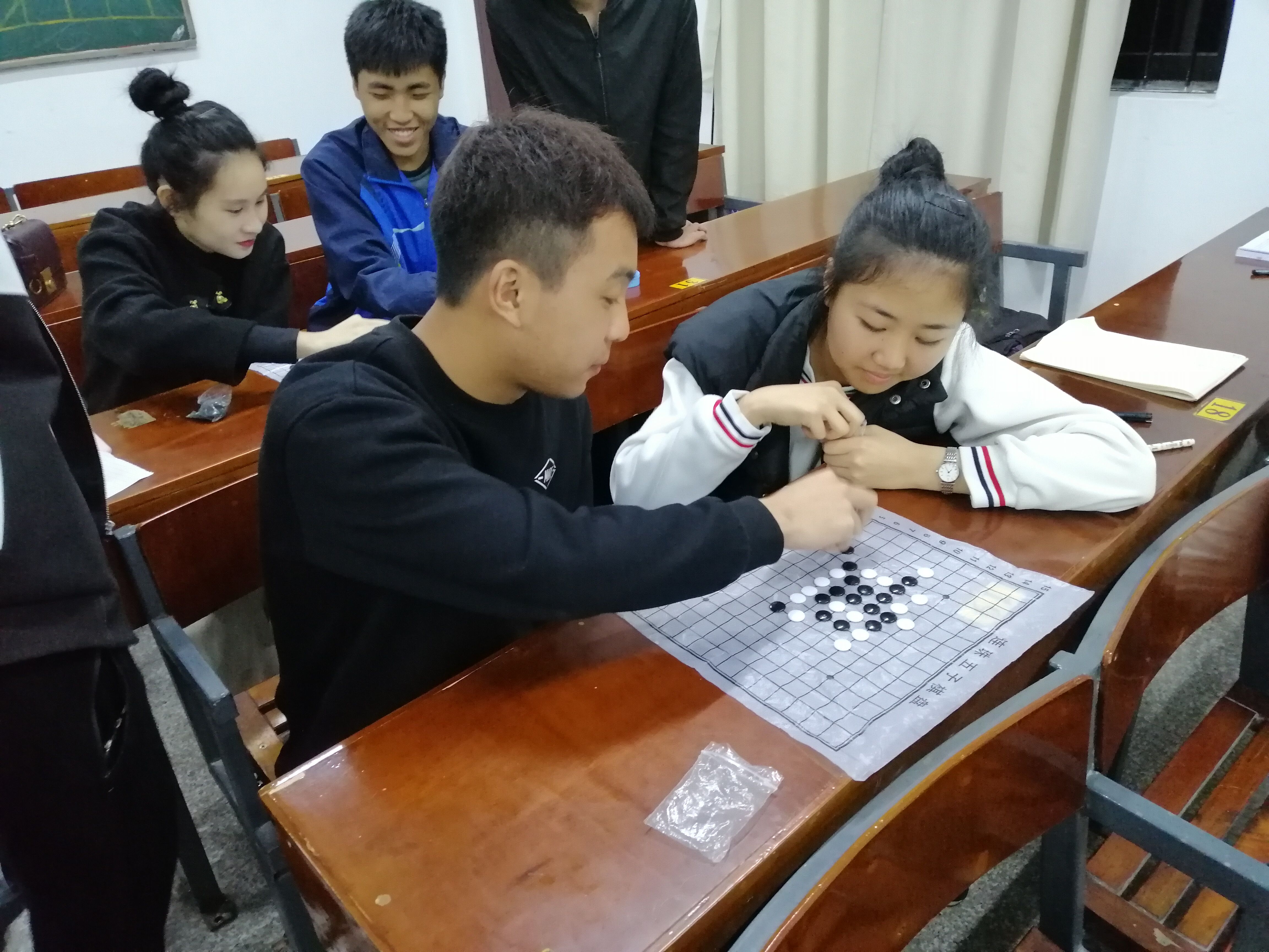 棋弈对阵,智谋比拼,楚河汉界,花落谁家。选手们从比赛一开始,就投入了这场思维战中,每张桌子都成了战场,你争我夺,一时间棋盘上纵横交错,战火熊熊,选手们你堵我截,或雷厉风行,或精雕细琢, 甚是精彩。围观的同学不少, 但大家都深谙 “观棋不语” 的道理, 在参赛者旁边站着,保持着安静,共享竞技的快乐。