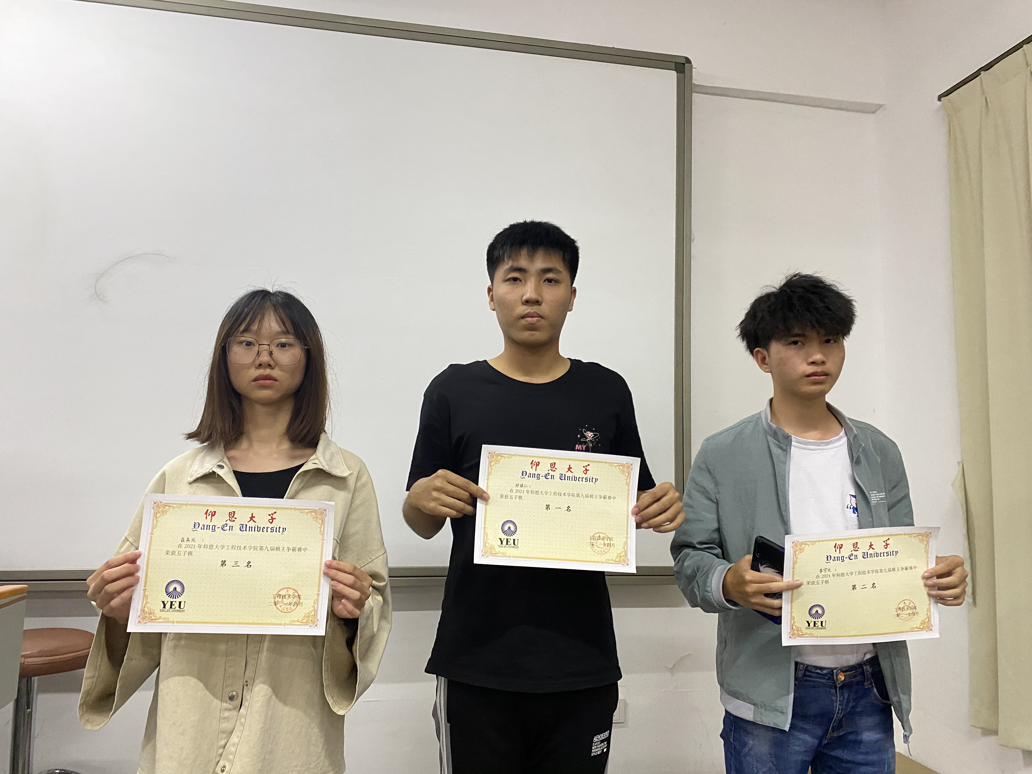 经过激烈的角逐,最终五子棋组:邵琪仁获得第一名,茅宗文获得第二名,薛燕凤获得第三名;军棋组:薛超伦获得第一名,郑居祥获得第二名,周维杰获得第三名;飞行棋组:吴雨霁获得第一名,宋健获得第二名, 赖瑞芳获得第三名;围棋组:刘榕获得第一名,林淑梅获得第二名,陈旸获得第三名;象棋组:陈海鹏获得第一名,乐宽榕获得第二名,黄俊鑫获得第三名;跳棋组:徐荣真获得第一名,陈园园获得第二名,许巧芸获第三名。