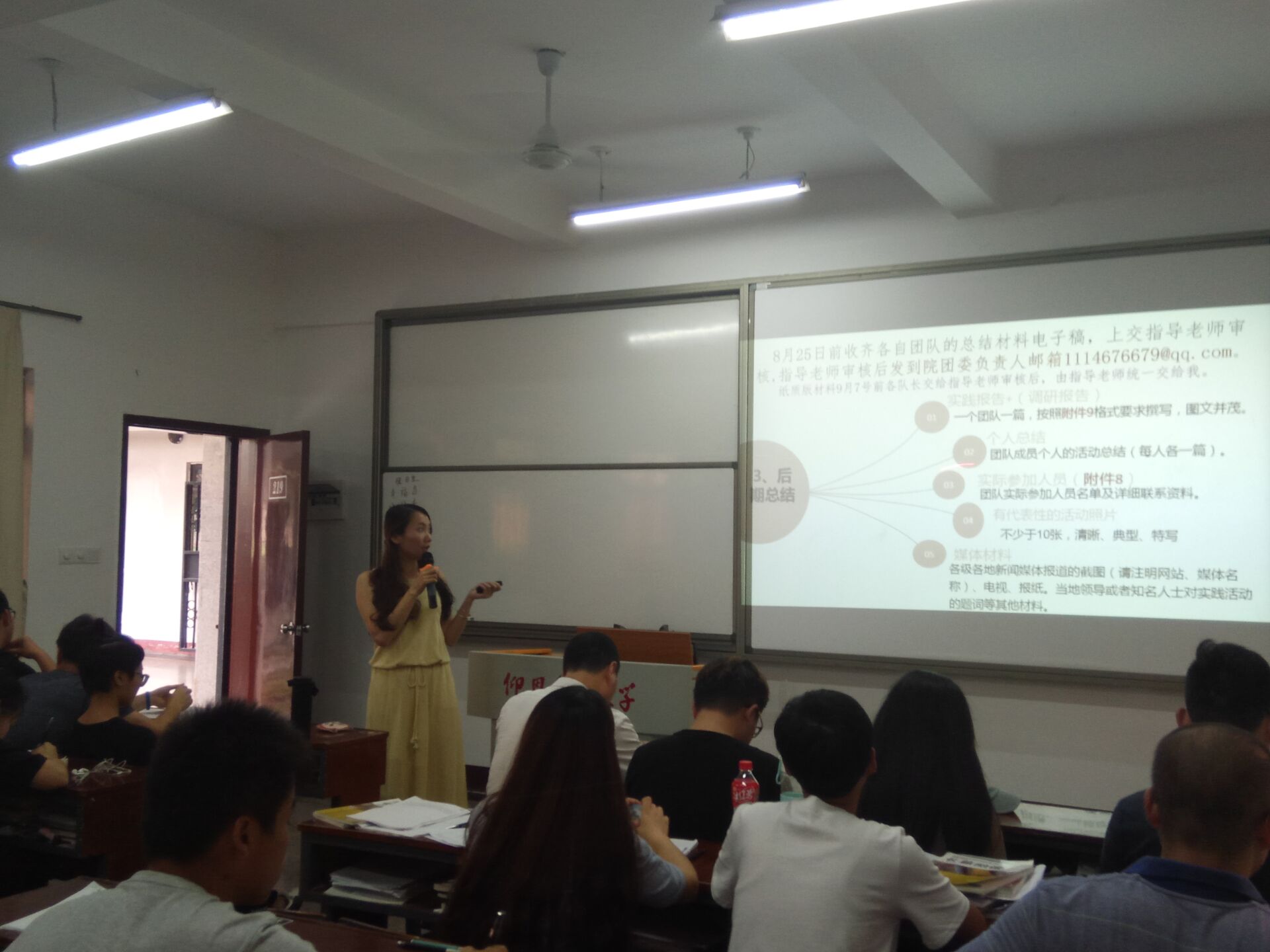 会议伊始,许淑琴针对暑期社会实践中的结项报告的书写、新闻稿的发表等问题对同学们进行培训与交流。她强调要保持书写内容的严谨性,条理的清晰性,认真对待暑期实践的一系列要求与任务。最后,再给大家进行社会实践中安全方面的培训。他分析各种安全问题状况与应对措施,强调安全问题大于天,一切有关安全的问题都应该认真严肃地对待。