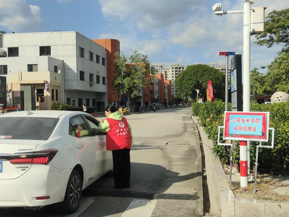 11月22日,支部党员和入党积极分子们在普照大礼堂举办的学院招聘会活动现场进行志愿服务,通过布置场地、道路指引、现场签到等助力学院招聘会有序开展。